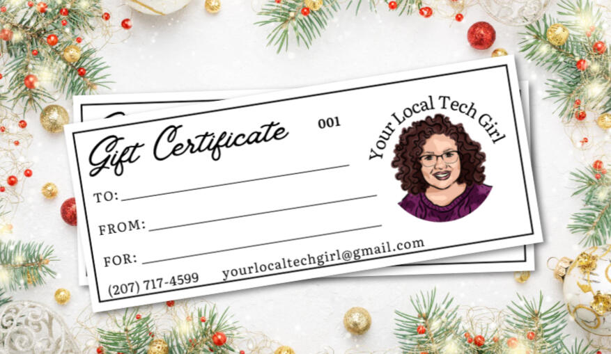 Need a gift for Mom, Dad, or someone who could use a little tech help? Looking for a thoughtful gift that supports a local small business?I’m excited to offer gift certificates for my tech assistance and digital organization services!Each certificate can be used toward any appointment — and there’s no expiration date. If the service costs more than the certificate value, the recipient can simply pay the difference. If there’s any balance left, it can be applied to a future appointment.For reference: As of now, a one-hour appointment is $15, which may help you decide the amount you'd like your certificate to be. (Prices may change over time.)Gift Certificate FAQI’ll have a limited number of certificates available for the season.